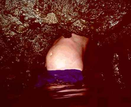 confirmed when I jumped in. The waves were pounding on the shore with the same intensity as yesterday, and our kayaks were pointing towards the ocean anticipating the rough take-off. One by one the paddlers took off though the surf. As we waited for the group to join us outside of the cove, some 8-ft. ocean swells lifted the front of our kayaks. Before long, we all were on our way to the next campsite at Ulaino. Not wanting to stray far from the coast, we clung next to the lava formations that dotted the Hana coast. Turning one of the corners there was a nice lee that appeared to have a campsite with a freshly trimmed lawn. Could this be Ulaino? Andy went down to scout and it looked like he was ready to set up the next campsite, when I got a call over the radio from Maghna that a campsite was clearly visible around the next point. Signaling to Andy that we were going to the next cove I paddled on. Here now was Ulaino, the fishing village and site of the largest Heiau on Maui, which kayakers have nicknamed Fish Camp. The other campsite was someone's private property. Bob had already landed in the mouth of a stream and was saying that he was going to stay there. To the left was Douglas, with his kayak high on a boulder beach. Of the two spots, the river mouth actually looked like there were larger swells in the shore break, so I choose to paddle down to where Douglas had landed. The campsite had a fisherman's shed that proved to be a nice area to cook, but it was in such terrible condition, it's hard to imagine it will be there the next time we return. Most of the Hui choose the shed over the river mouth, and soon we were making our way over to where Maghna, Bob, and Gary were spending the night in the path of what seemed like an endless line of day-tourists visiting the Helele Ike Oha Falls, better known as the "Blue Pool". The Blue Pool is a beautiful pool that has a small waterfall surrounded by exotic flowering plants of red, yellow and blue. 'Ape and 'awapuhi added a very tropical appearance to the flora. The whole area appears carefully manicured causing Danny to say it looked like something out of Disneyland.