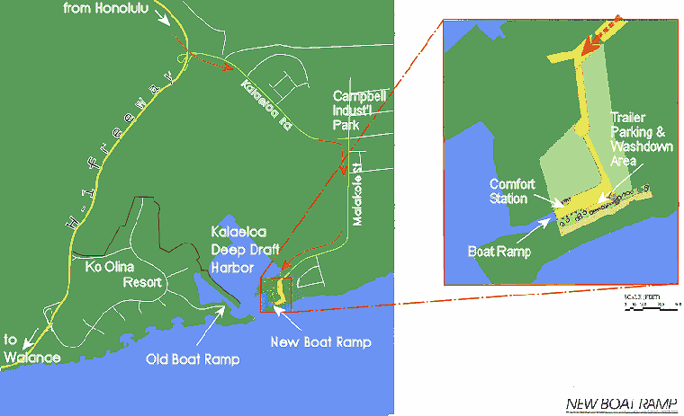 In 2005, in a spectacular display of community aloha, Ko Olina Resort abruptly closed - and demolished - their boat ramp abutting the Barber's Point Deep Draft Harbor, thus removing the only public small-boat access to the ocean between the Waianae Small Boat Harbor and Keehi Lagoon, a distance of almost 30 miles.